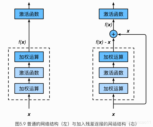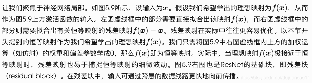 对神经网络模型添加新的层,充分训练后的模型是否只可能更有效地降低训练误差?理论上,原模型解的空间只是新模型解的空间的⼦空间。也就是说,如果我们能将新添加的层训练成恒等映射 ,新模型和原模型将同样有效。由于新模型可能得出更更优的解来拟合训练数据集,因此添加层似乎更容易降低训练误差。然而在实践中,添加过多的层后训练误差往往不降反升。即使利用批量归一化带来的数值稳定性使训练深层模型更加容易,该问题仍然存在。针对这一问题,何恺明等人提出了残差⽹网络(ResNet)。它在2015年的ImageNet图像识别挑战赛夺魁,深刻影响了后来的深度神经网络的设计。